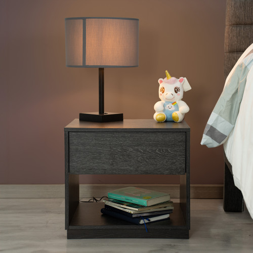 Mesa de noche de estilo moderno en líneas rectas. Tiene un cajón superior con amplio espacio de almacenamiento. Apertura sin manija, la tapa del cajón cuenta con un borde biselado de fácil agarre y desliza con facilidad gracias a un herraje tipo riel. Por su parte inferior dispone de un espacio abierto para almacenaje adicional. Elaborado con materiales de calidad, resistentes y duraderos para que puedas utilizarlo por muchos años.